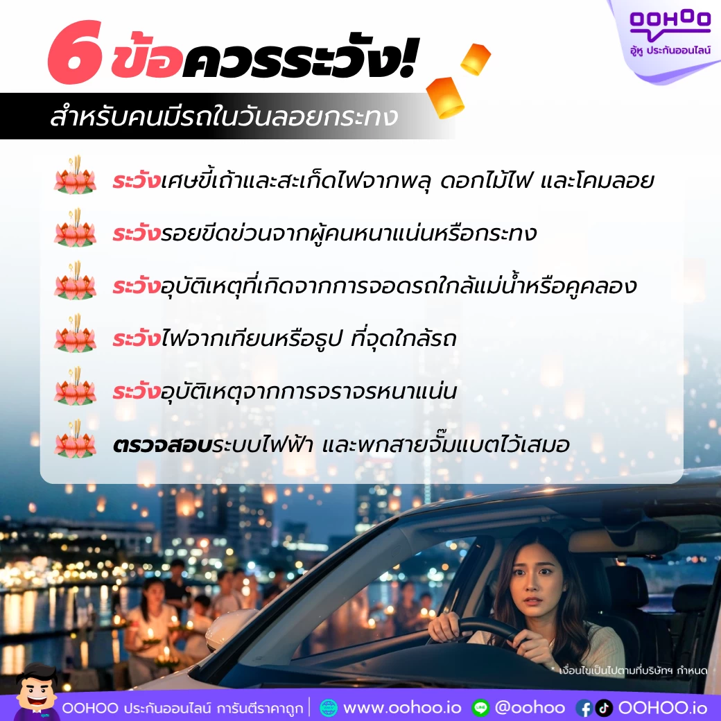ลอยกระทงให้สนุก ปลอดภัย และไม่ต้องกลัวเรื่องรถ เทศกาลแห่งความสุขนี้จะสมบูรณ์แบบก็ต่อเมื่อทุกอย่าง “ปลอดภัย” ทั้งตัวคุณและรถของคุณ เพียงระมัดระวังในจุดเล็ก ๆ เหล่านี้ ก็ช่วยลดความเสี่ยงจากอุบัติเหตุหรือความเสียหายได้มาก ต่อประกันรถยนต์กับ OOHOO.IO อุ่นใจทุกเทศกาล แม้จะระวังแค่ไหน บางครั้งอุบัติเหตุก็เกิดขึ้นได้โดยไม่คาดคิด ดังนั้น “การมีประกันรถยนต์ที่คุ้มครองครบถ้วน” คือสิ่งสำคัญที่เจ้าของรถทุกคนควรมี