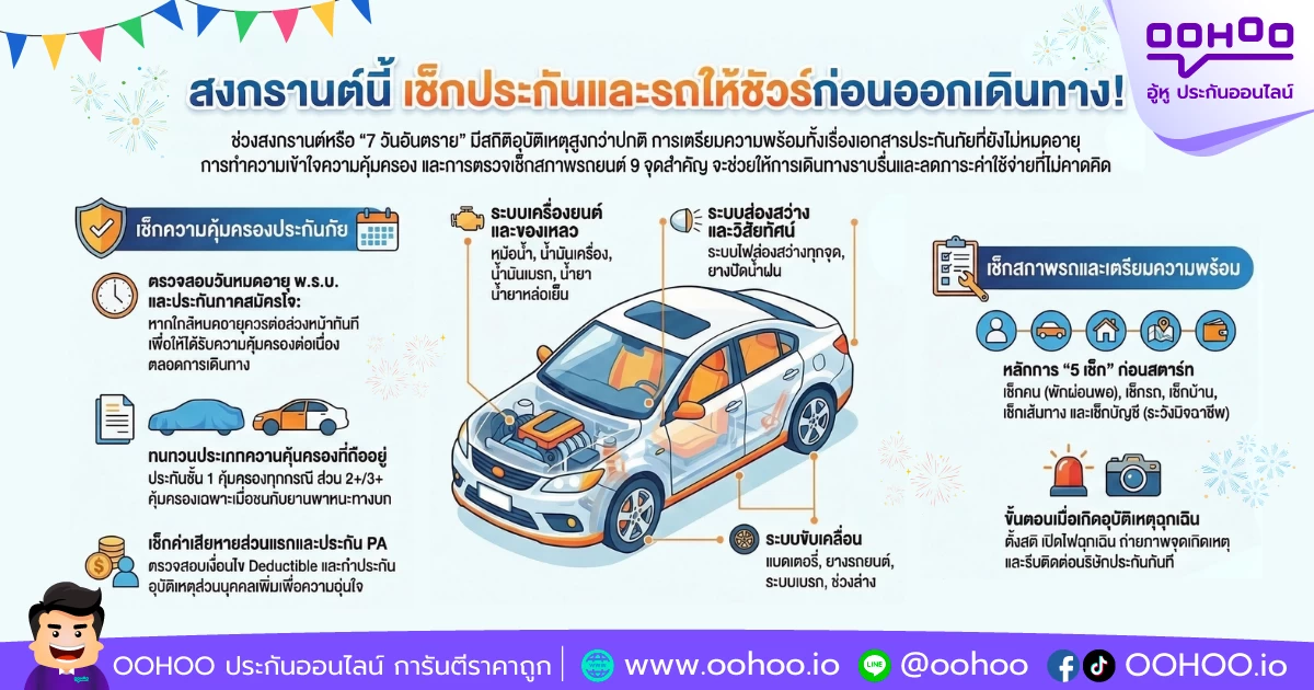 เทศกาลสงกรานต์ควรเป็นช่วงเวลาแห่งความสุข ไม่ใช่ความกังวล การตรวจสอบ พ.ร.บ. ประกันรถยนต์ ประกันอุบัติเหตุ และสภาพรถ ก่อนออกเดินทาง อาจใช้เวลาเพียงไม่กี่นาที แต่ช่วยลดความเสี่ยงทั้งชีวิตและทรัพย์สินได้อย่างมาก อย่าลืมวางแผนการเดินทาง ตรวจเช็กความพร้อมของรถ และงดแอลกอฮอล์ 100% เพื่อให้ทุกการเดินทางปลอดภัยตลอดทริป