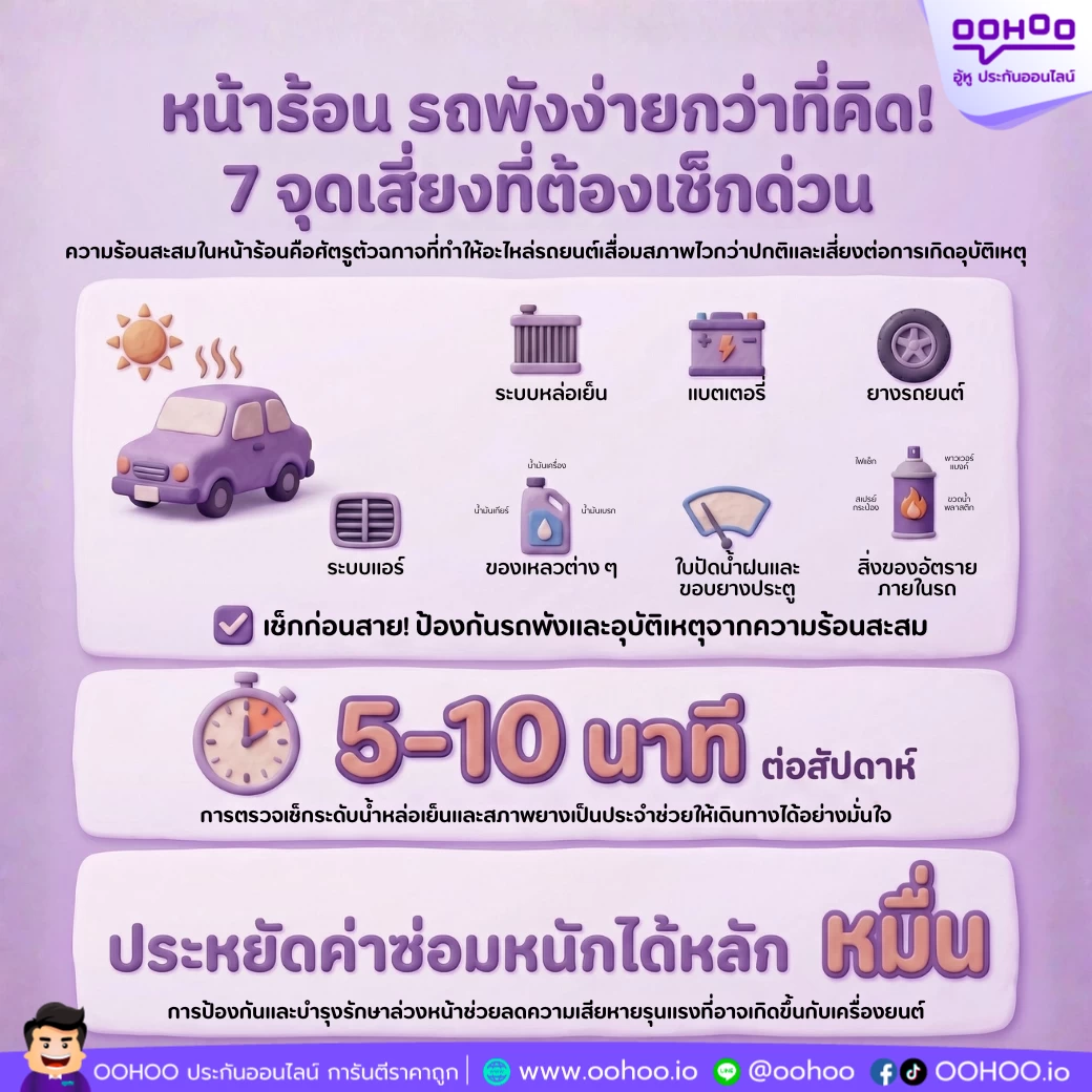 หน้าร้อนเป็นช่วงที่หลายคนต้องเดินทางมากขึ้น แต่ในขณะเดียวกัน อุณหภูมิที่สูงก็ทำให้ รถยนต์มีโอกาสเกิดปัญหาได้ง่ายกว่าปกติ ไม่ว่าจะเป็นเครื่องยนต์โอเวอร์ฮีต แบตเตอรี่เสื่อมเร็ว หรือยางรถยนต์สึกหรอไว การตรวจเช็ก 7 จุดสำคัญของรถยนต์ เช่น หม้อน้ำ แบตเตอรี่ ยางรถยนต์ ระบบแอร์ น้ำมันเครื่อง สายพาน และระบบเบรก จะช่วยลดความเสี่ยงรถเสียกลางทาง และทำให้การขับขี่ปลอดภัยมากยิ่งขึ้น