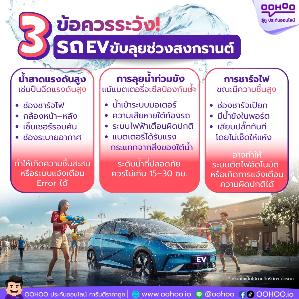 การขับรถไฟฟ้าตะลุยวันสงกรานต์ ไม่ได้เสี่ยงเครื่องยนต์เสียหายโดยตรง หากใช้งานตามปกติ เพราะระบบไฟฟ้าถูกออกแบบให้กันน้ำได้ตามมาตรฐาน แต่ความประมาท เช่น ลุยน้ำลึก หรือไม่มีประกันรองรับ อาจทำให้คุณต้องเสียค่าใช้จ่ายหลักหมื่นถึงหลักแสนบาทได้